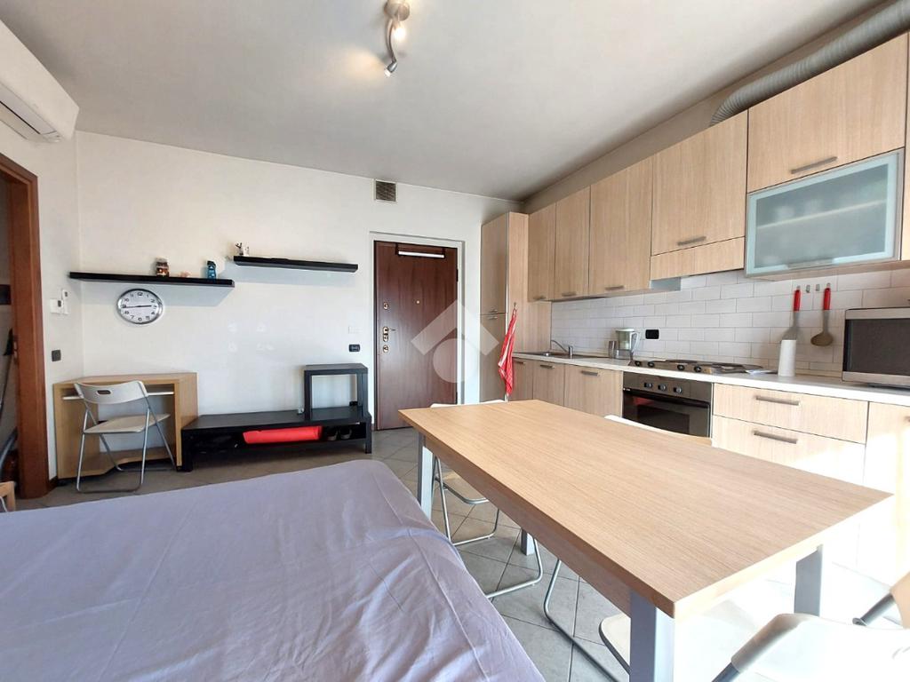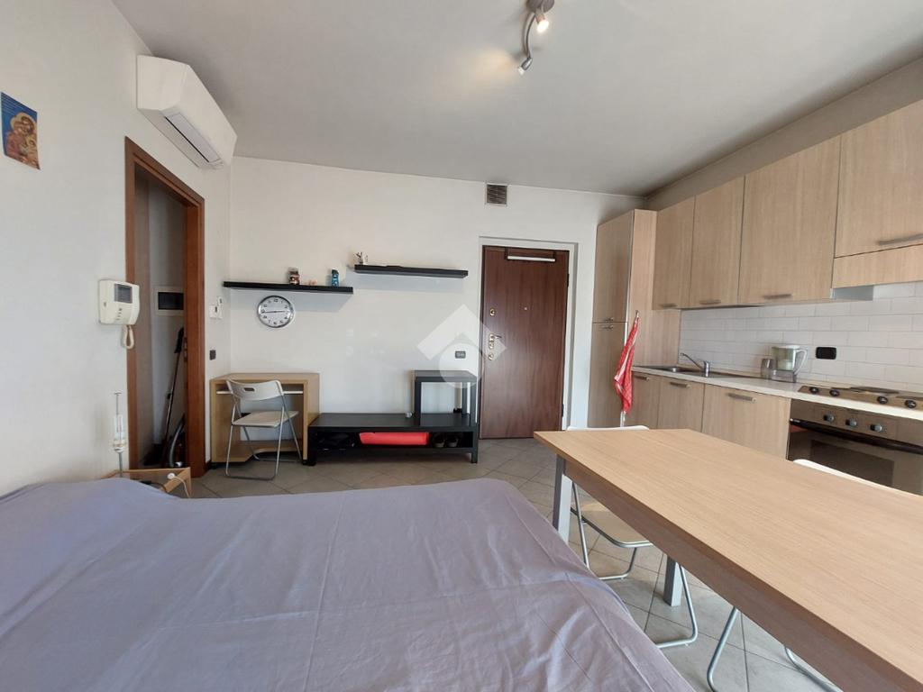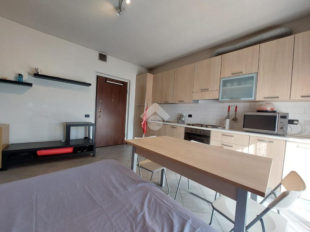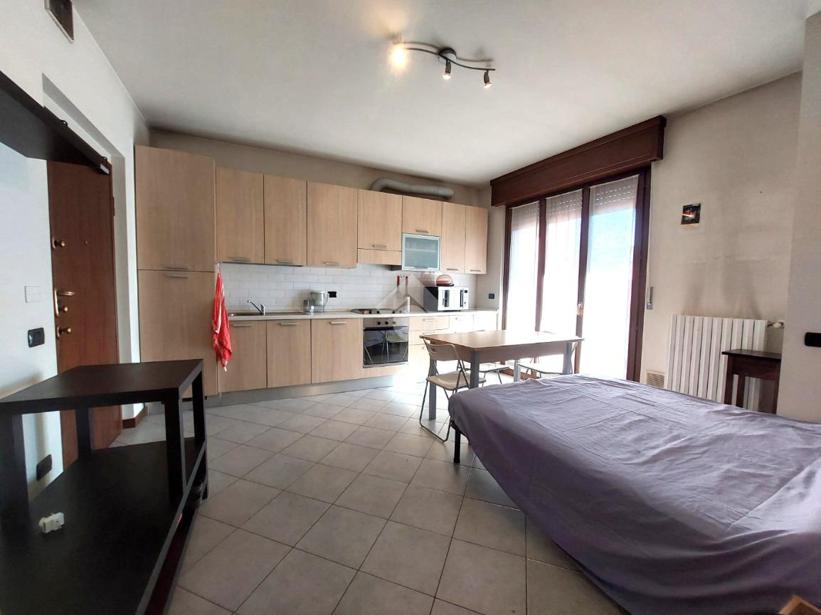 Monolocale con cucina a vista con accesso al terrazzo coperto, disimpegno completo di armadio e servizio finestrato.