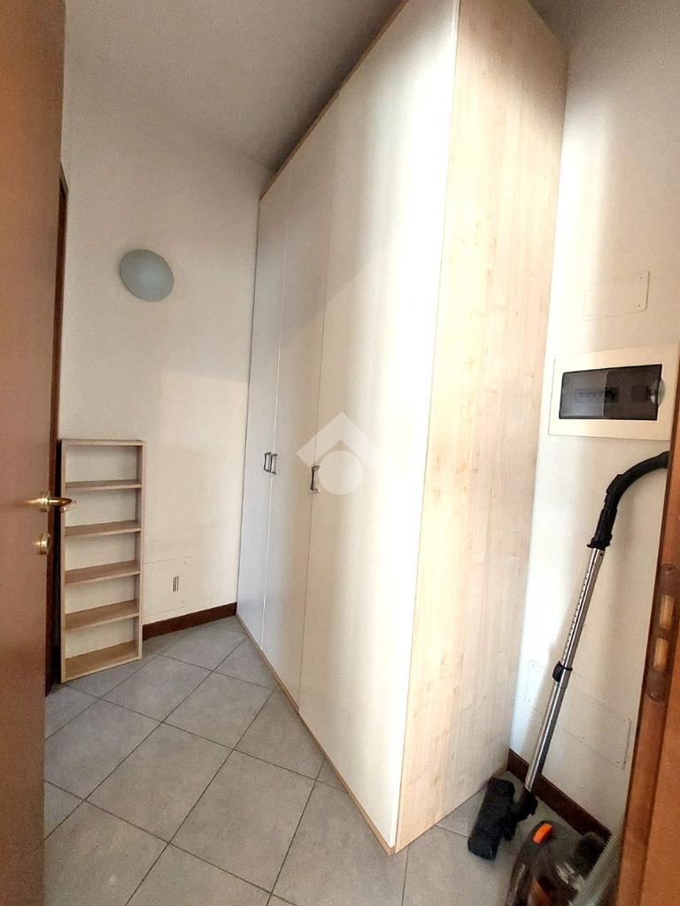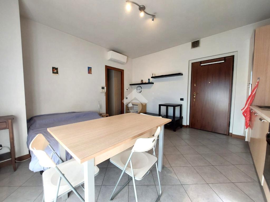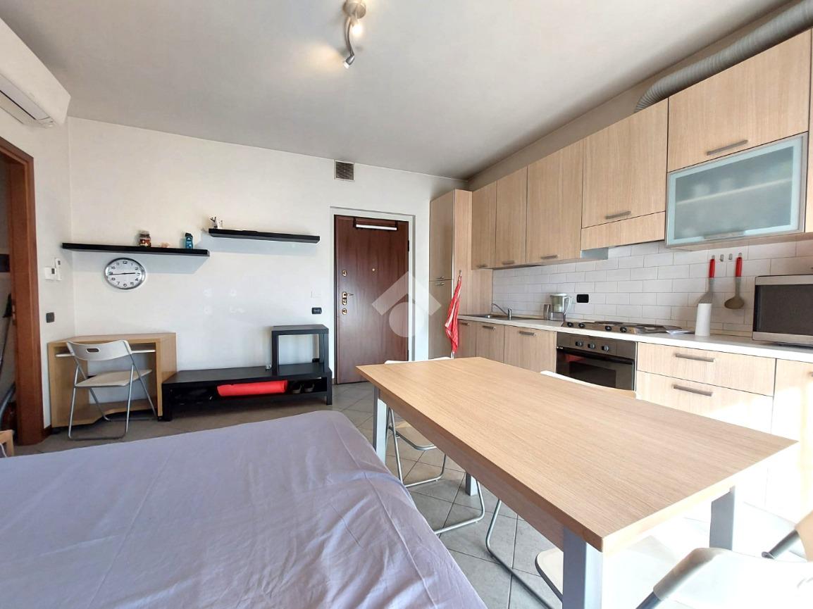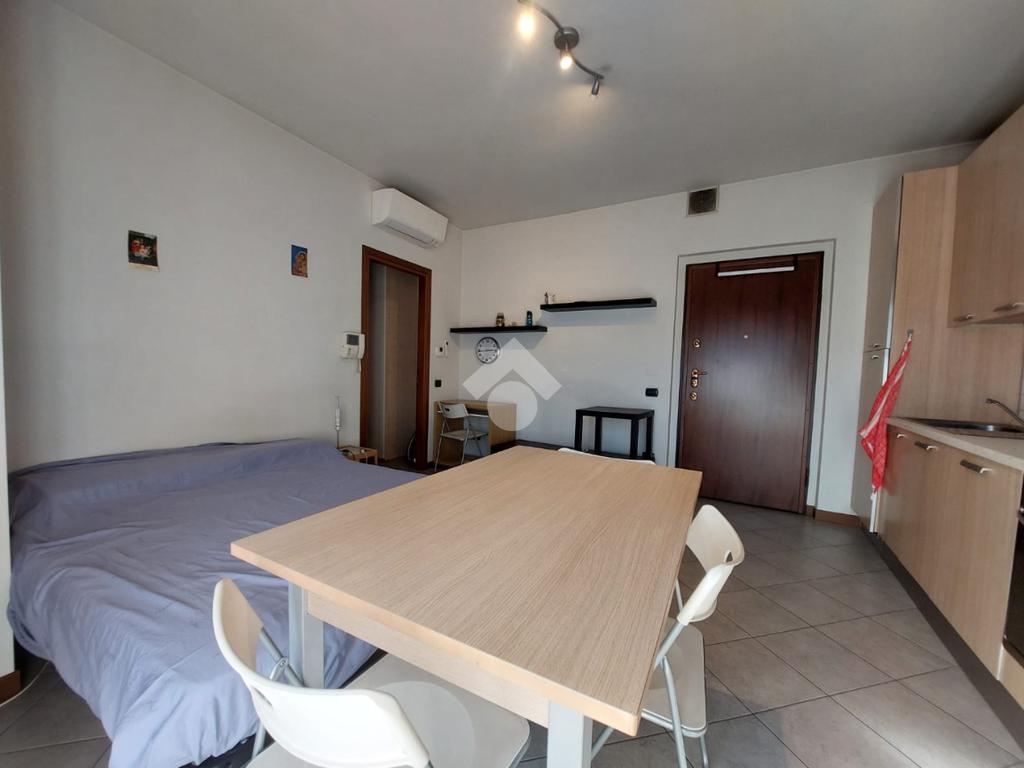 Monolocale con cucina a vista con accesso al terrazzo coperto, disimpegno completo di armadio e servizio finestrato.