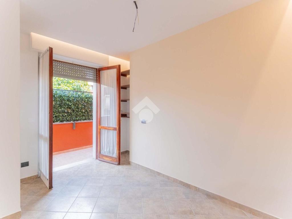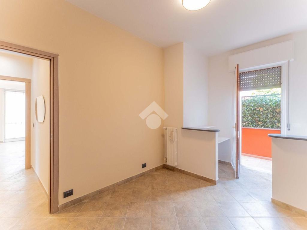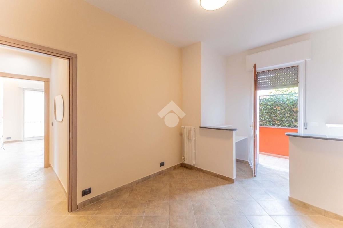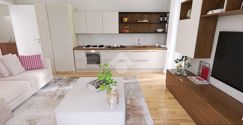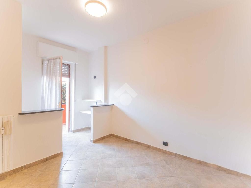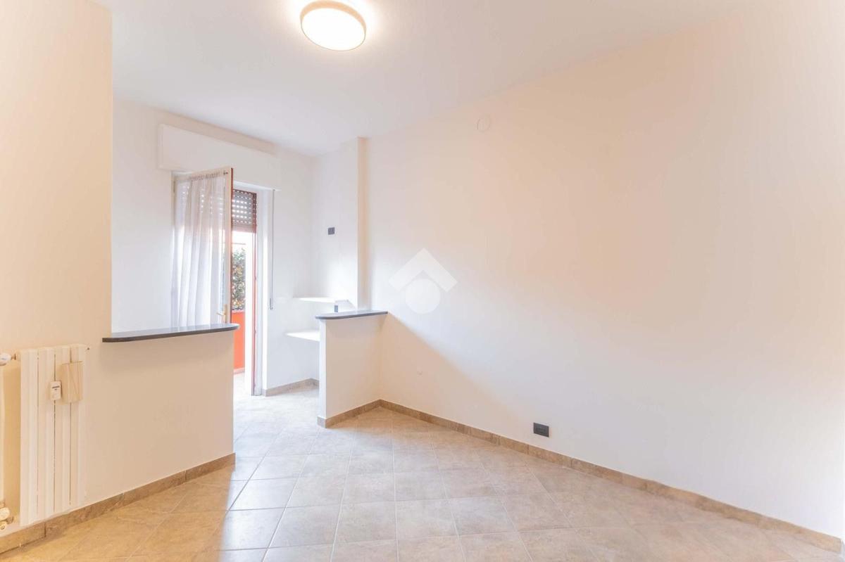 L'immobile è composto da un luminoso soggiorno con cucina a vista con due porte finestre che conducono al balcone che affaccia sull'interno della corte.