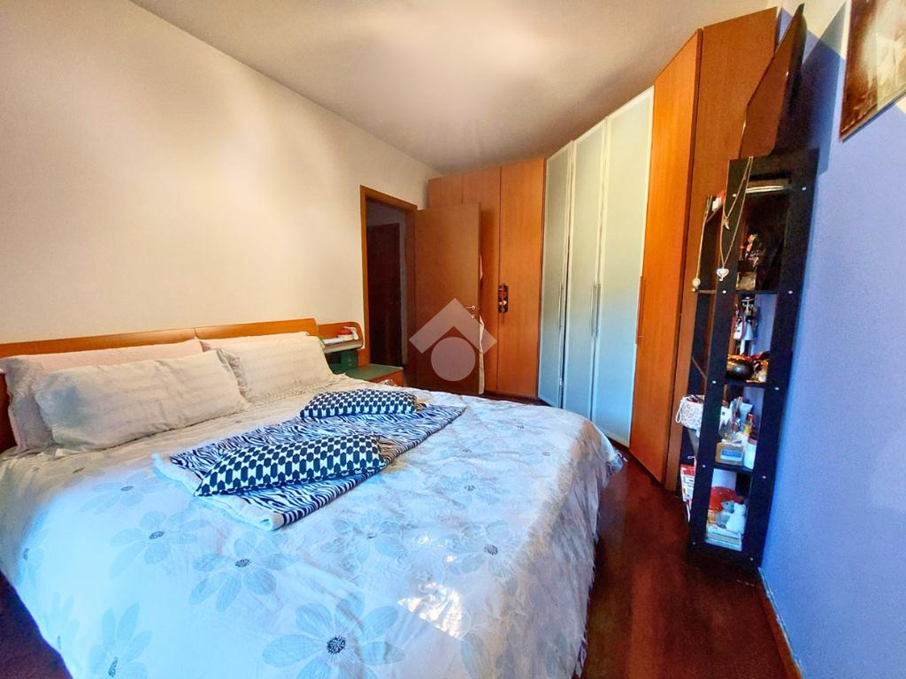 Attraverso un piccolo disimpegno si accede alla zona notte composta dalla camera matrimoniale, rifinita con parquet, e dal servizio finestrato con doccia.
